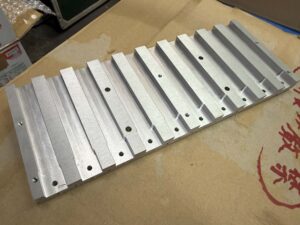 分厚い無垢のアルミ板のまま削るよりも、このように溝を設けて断面積を減らすことで、金属が自由に動けるスペースが生まれ、反ろうとする力を上手く分断・吸収することができるのです。