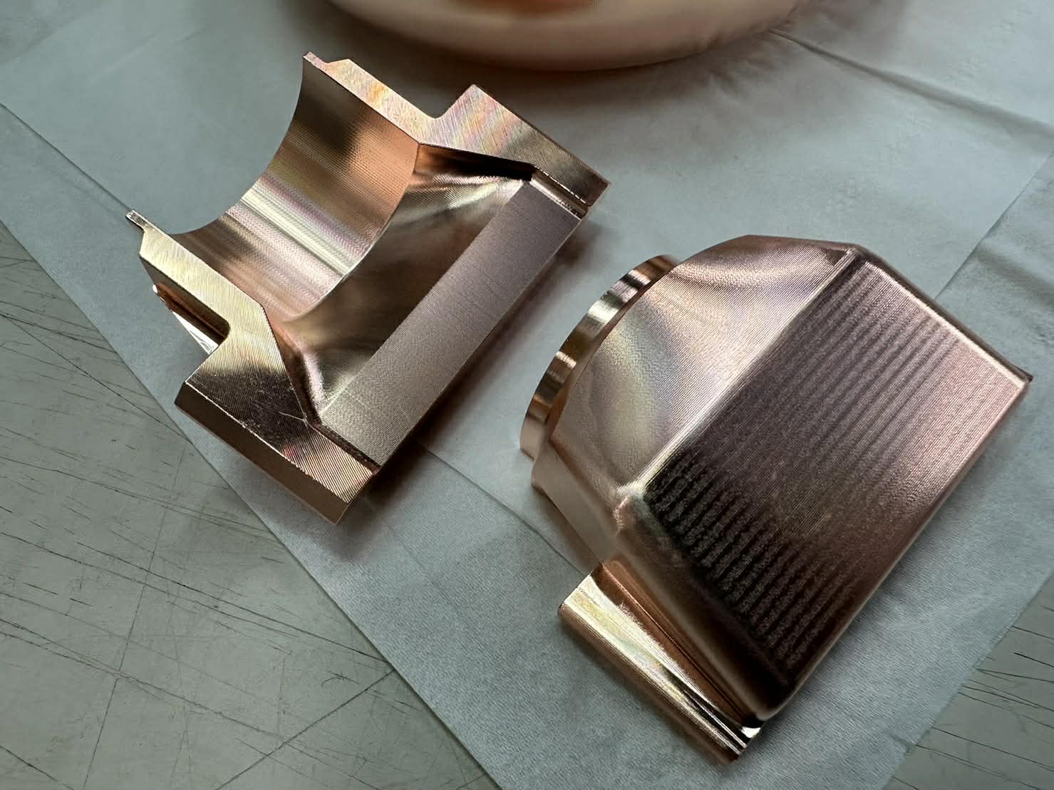 ・粘り気の強い「銅」の特性への対応 銅は熱伝導率が高く延性(伸びる性質)があるため、切削時に材料が工具に溶着しやすく、バリが発生しやすい難削材の一つです。 弊社では、銅加工に適した鋭利な刃形を持つ工具選定と、熱変位を抑える最適な切削条件(回転数・送り速度)の追求により、複雑な3次元曲面においても、切削目が均一で美しい光沢面を実現しました。